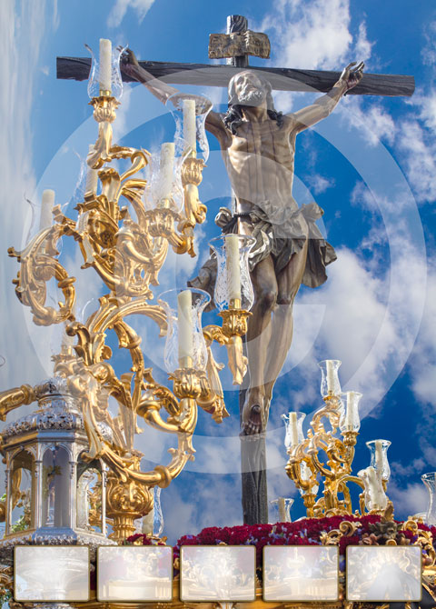 Este año hemos elegido una elegante fotografía del Cristo de la Expiración de la Hermandad del Cachorro en la que el crucificado tiene una posición privilegiada pero destaca em primer plano los faroles del paso.